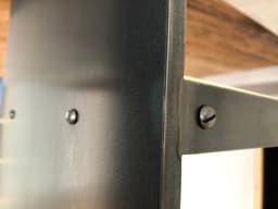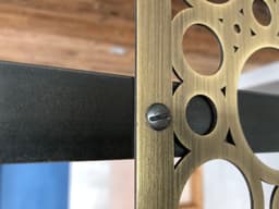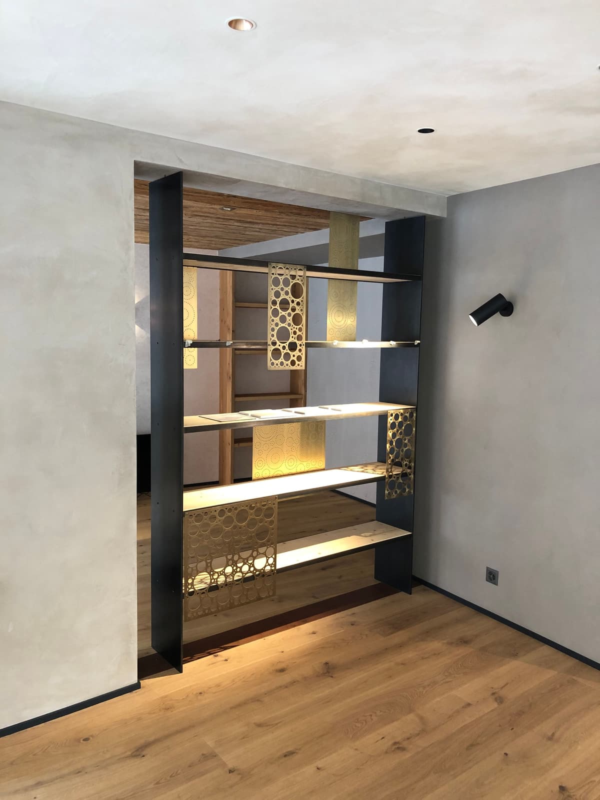 Étagère en acier brut avec éléments décoratifs en laiton patiné.