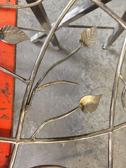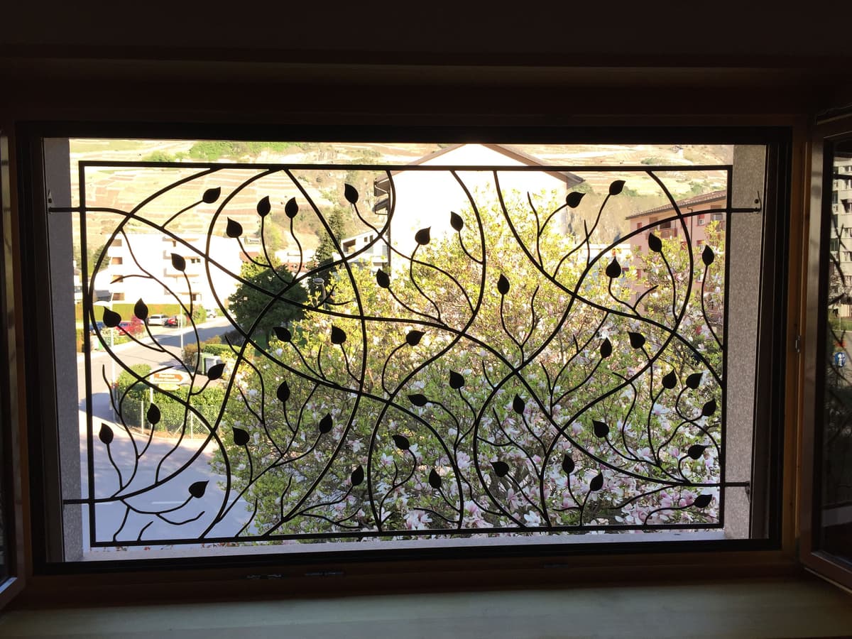 Grille de fenêtre en fer forgé aspect feuillage.