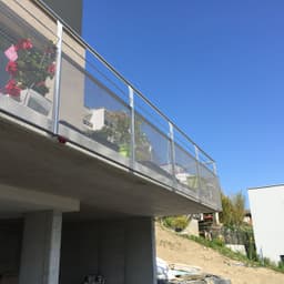 TERRASSE: Garde-corps en inox avec tôle perforée. La volonté du client un maximum de transparence. Les poteaux font 1cm d’épaisseur et la tôle avec un vide lumière de 63%.