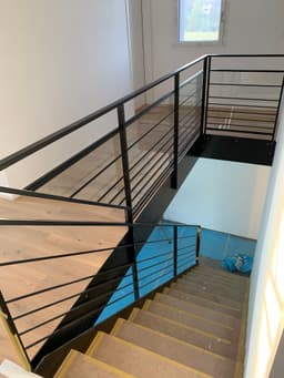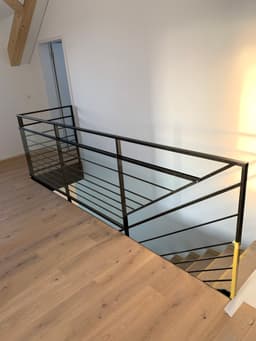 Pour gagner un maximum de largeur à l'escalier, on a aligné la barrière de l'escalier avec celle du palier. Le barreaux horizontales sont interrompues par le prolongement de la main-courante de l'escalier.