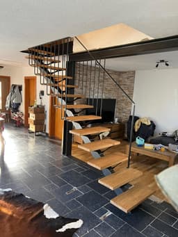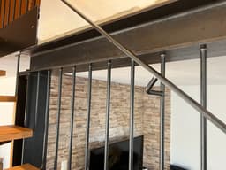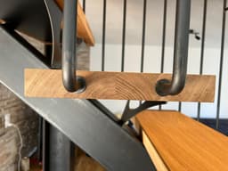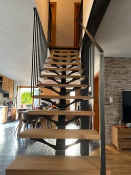 Pose d'une structure métallique et d'un nouvel escalier métal avec marches en chêne.